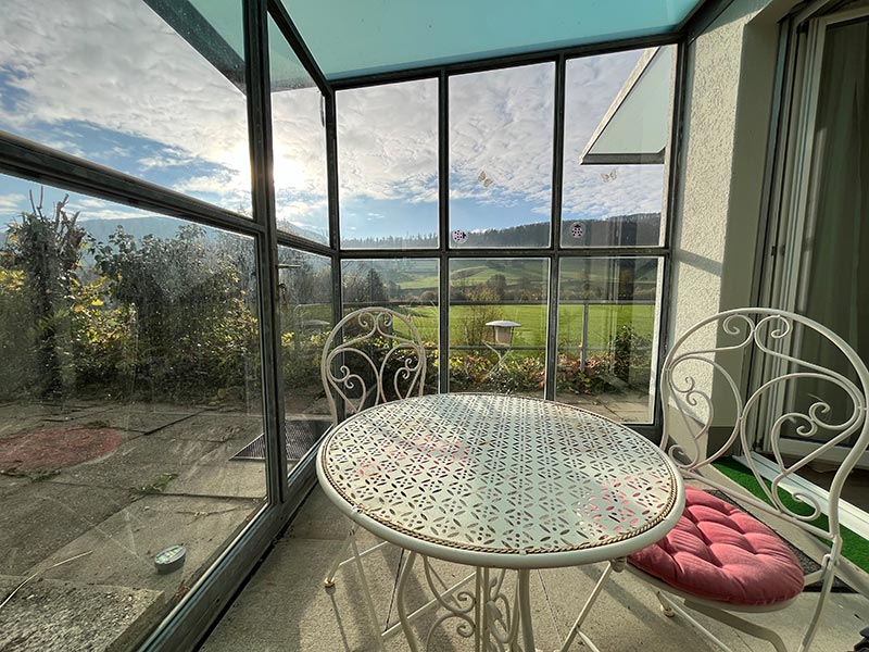 Kleiner Sitzplatz und ungeheizter Wintergarten mit Sicht ins Grüne und Garten