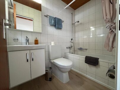 Die neu renovierte Wohnung enthält eine offene, gut ausgestattete Küche mit Geschirrspüler, ein gemütliches Wohnzimmer mit toller Aussicht ins Grüne, 1 Schlafzimmer mit Doppelbett und das 2. Zimmer nutzbar als Büro (gratis WLAN) oder Schlafzimmer mit 2 Schlafmöglichkeiten. Separates Babybett vorhanden.